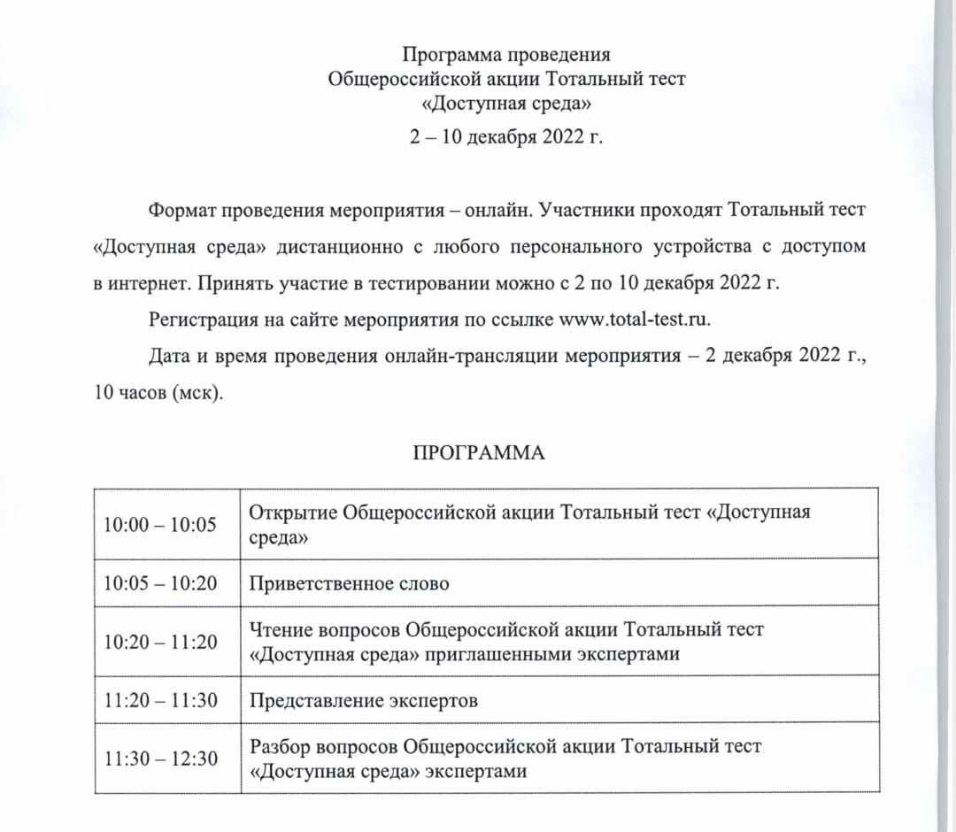 23.11.2022ОБЩЕРОССИЙСКИЙ НАРОДНЫЙ ФРОНТ и Национальная ассоциация участников рынка ассистивных технологий «АУРА-Тех» с 2 по 10 декабря 2022 года проводят крупнейшую общероссийскую акцию в сфере инклюзии, приуроченную к Международному дню инвалидов, – Тотальный тест «Доступная среда». Мероприятие направлено на привлечение внимания жителей России к теме инклюзии и доступной среды, а также улучшения качества жизни людей с инвалидностью и других социально уязвимых категорий населения.Официальное открытие Общероссийской акции Тотальный тест «Доступная среда» состоится 2 декабря 2022 года. Тестирование традиционно проводится в онлайн-формате с 2 по 10 декабря 2022 года. Оно включает в себя вопросы по нескольким тематическим блокам:- создание доступной среды,- этика общения с людьми с инвалидностью,- правила оказания ситуационной помощи. Регистрация на сайте мероприятия по ссылке www.total-test.ru.По итогам общероссийской акции Тотальный тест «Доступная среда» будет сформирован рейтинг субъектов Российской Федерации по уровню вовлеченности в мероприятия по созданию условий доступности социальной инфраструктуры для людей с инвалидностью и других маломобильных групп населения и знаний представителей субъектов Российской Федерации по вопросам инклюзии и организации доступной среды.Приглашаем принять участие в Общероссийской акции Тотальный тест «Доступная среда».