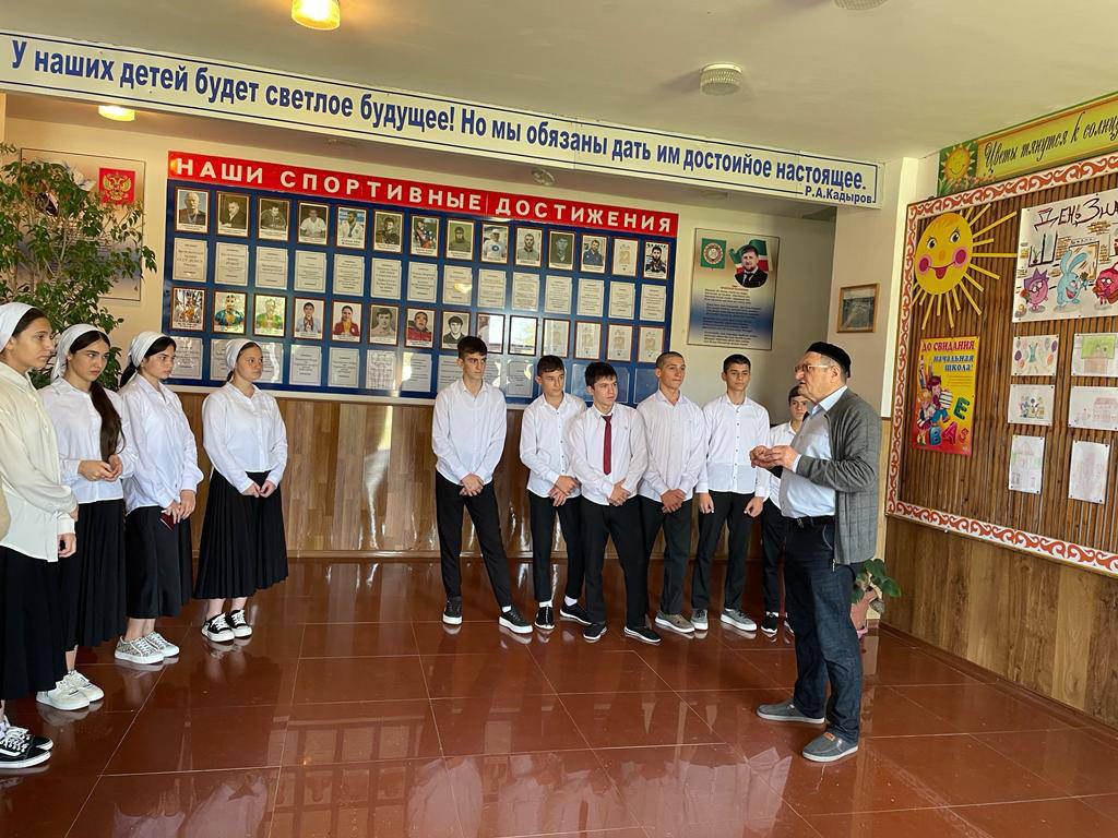 Руководитель сельского музея «Боевой и Трудовой Славы» Хаджимагомадов М. А. провёл беседу с учащимися 9-х классов на тему «Герои земли Русской», посвящённую дню победы русских полков во главе с великим князем Дмитрием Донским над монголо-татарскими войсками в Куликовский битве.