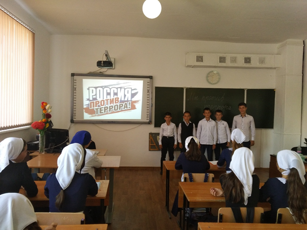 03.09.20173 сентября объявлен днем солидарности в борьбе с терроризмом, это день скорби по погибшим людям, в том числе и детям в Беслане. Каждый ученик должен знать правила предупреждения и поведения в случае угрозы или возникновения террористического акта. Хочется верить в то, что уже нигде на земле не прогремят взрывы. Классные руководители 5-11 классов провели классные часы на темы «Мы против терроризма», провели беседы, демонстрацию видеороликов из Интернета. В своих беседах они пришли к общему выводу: все террористические акты являются жестокими и бесчеловечными.