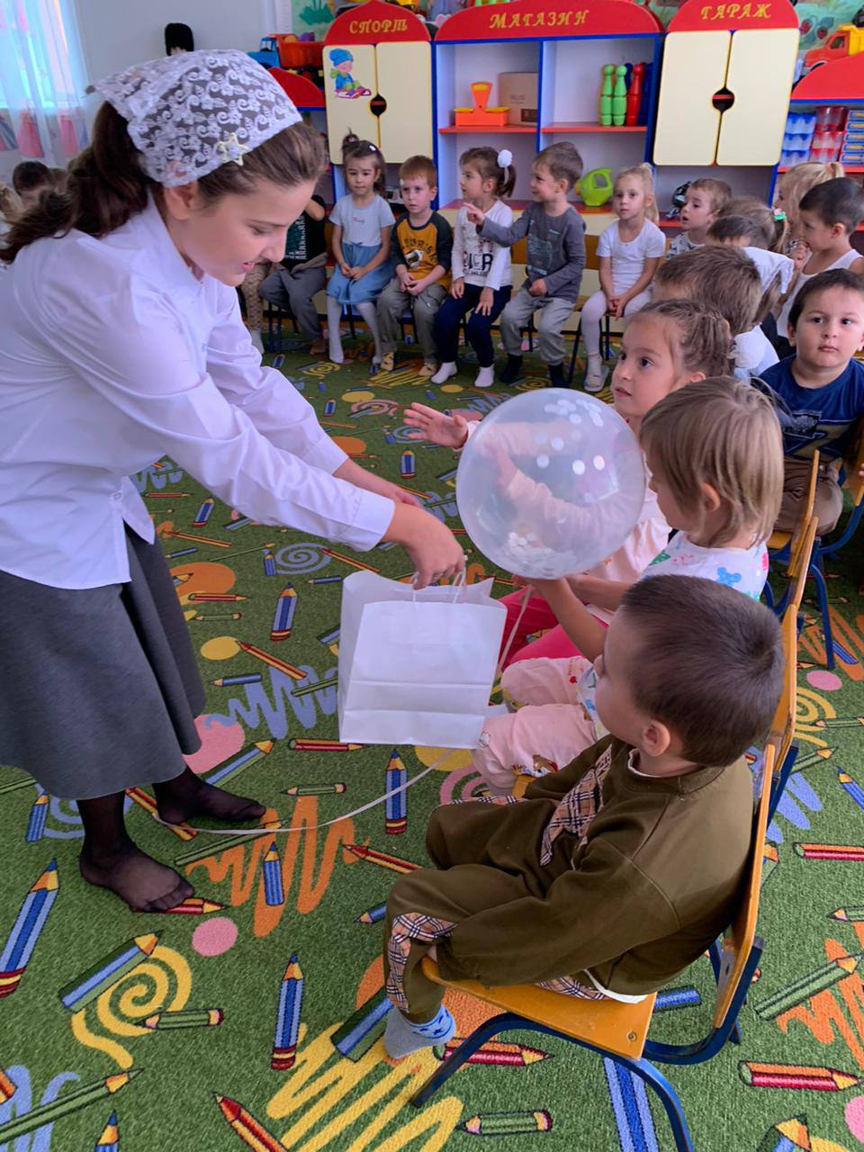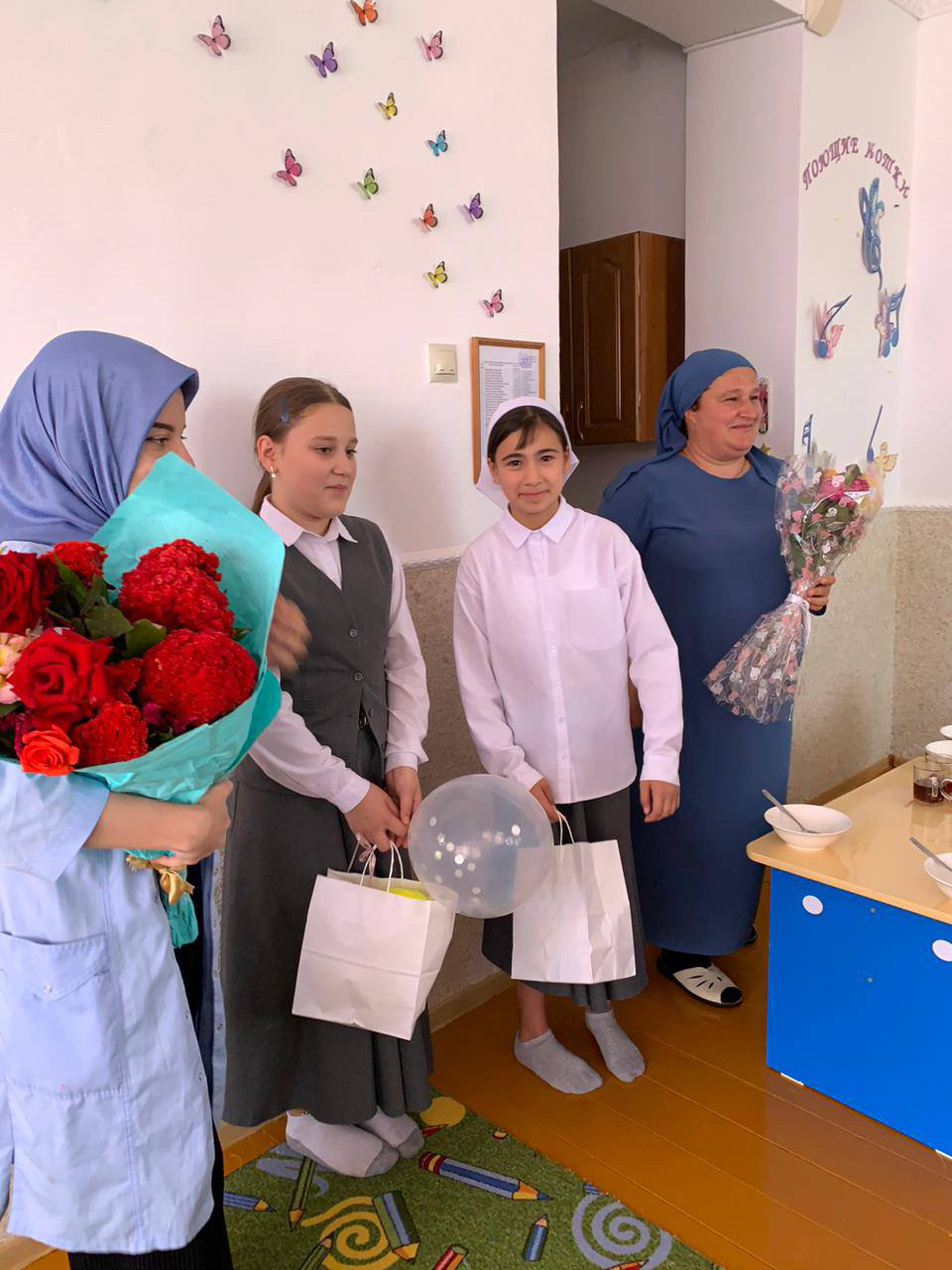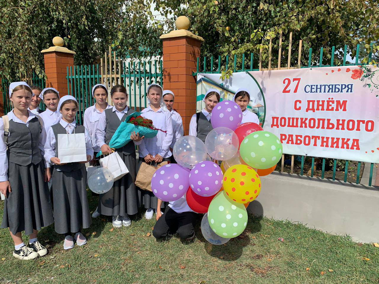 Учащиеся 6 «б» класса с классным руководителем Магомадовой Мадиной Нажиуллаевной посетили детский сад села Новотерское и поздравили воспитателей и других работников сада с их профессиональным праздником.