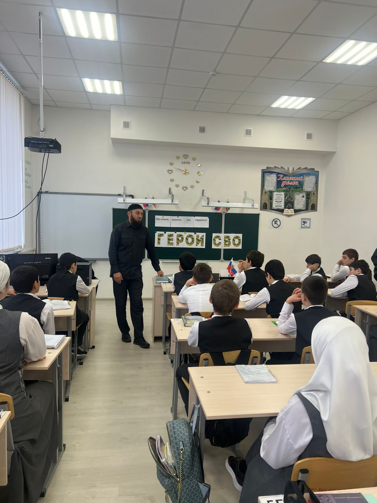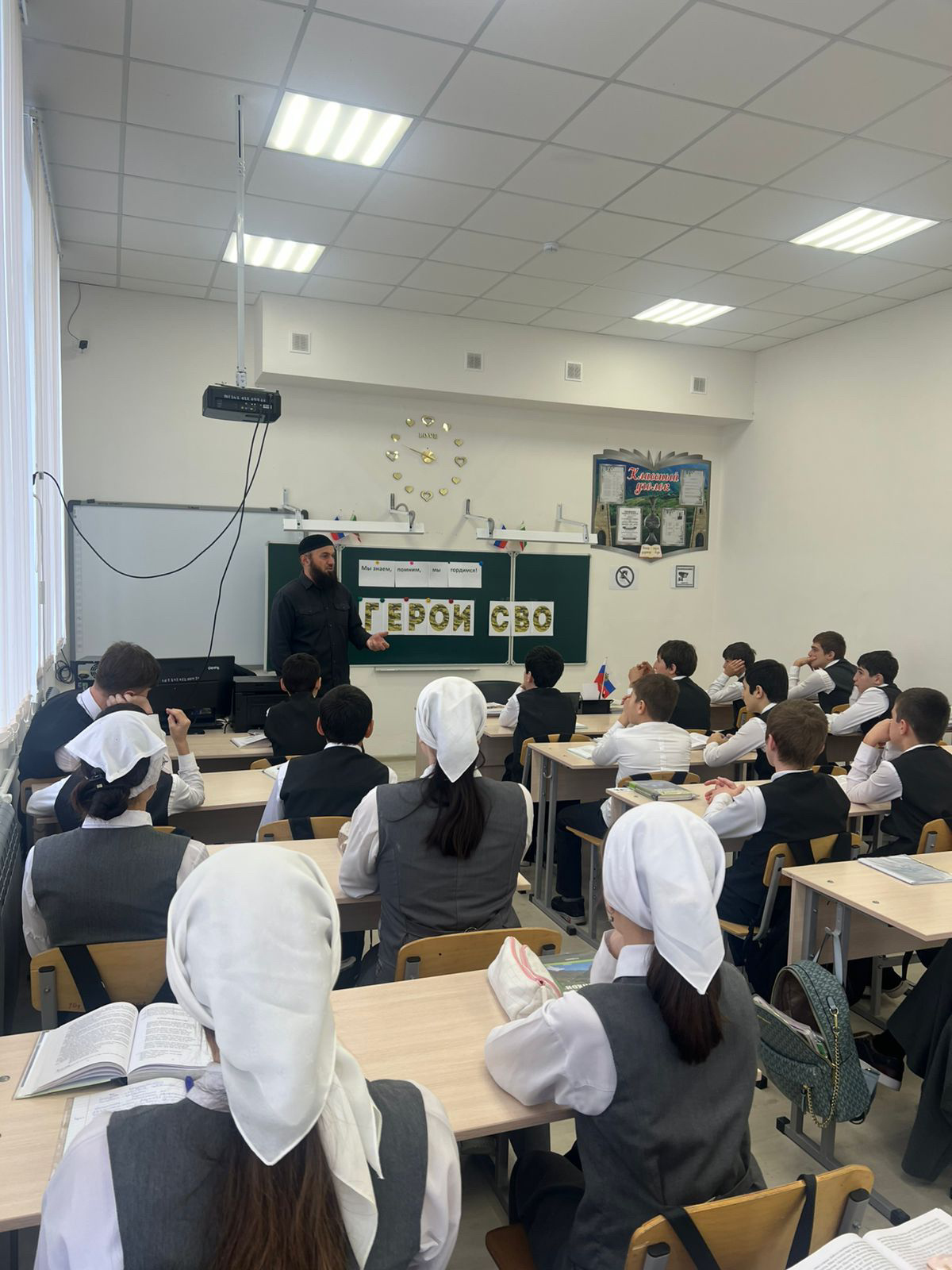 Педагог -организатор по ДНВ Исраилов И. И. провел беседу с учащимися о необходимости проведения специальной военной операции. Также, он рассказал о подвигах участников СВО. О их самоотверженных поступках на пути служения Родине.