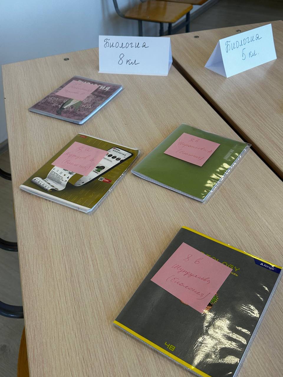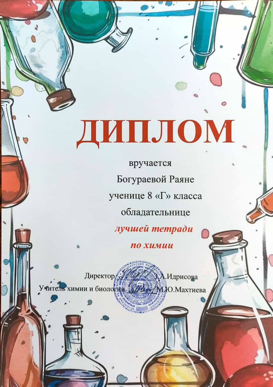Самыми лучшими были выбраны тетради по химии: Мутузова М. 8 «а» кл.; Богураевой Р. 8 «г»; Муслимовой А. 9 «а»; Хутиевой А. 10 «б»; Байтемиевой К. 9 «б»; Магомадовой Р. 10 «б»; Исаевой А. 8 «г»; тетрадь по биологии Мутузовой А. 5 «б».