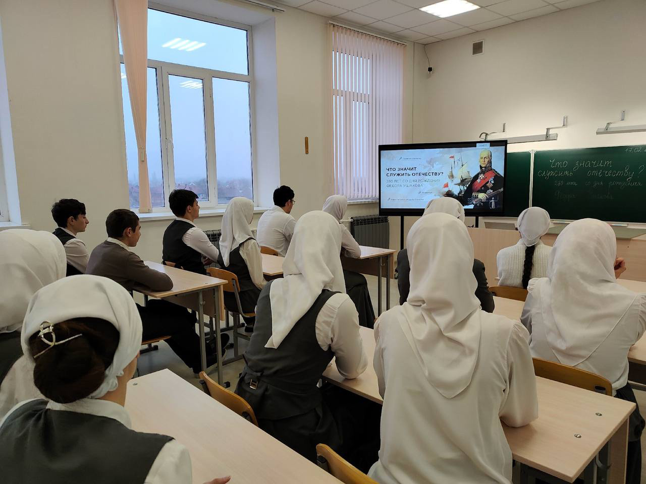 На занятии учащиеся смотрели видеоролик "Жизнь и подвиги Фёдора Ушакова", в котором было рассказано о трудных, но славных страницах истории, связанных с адмиралом.