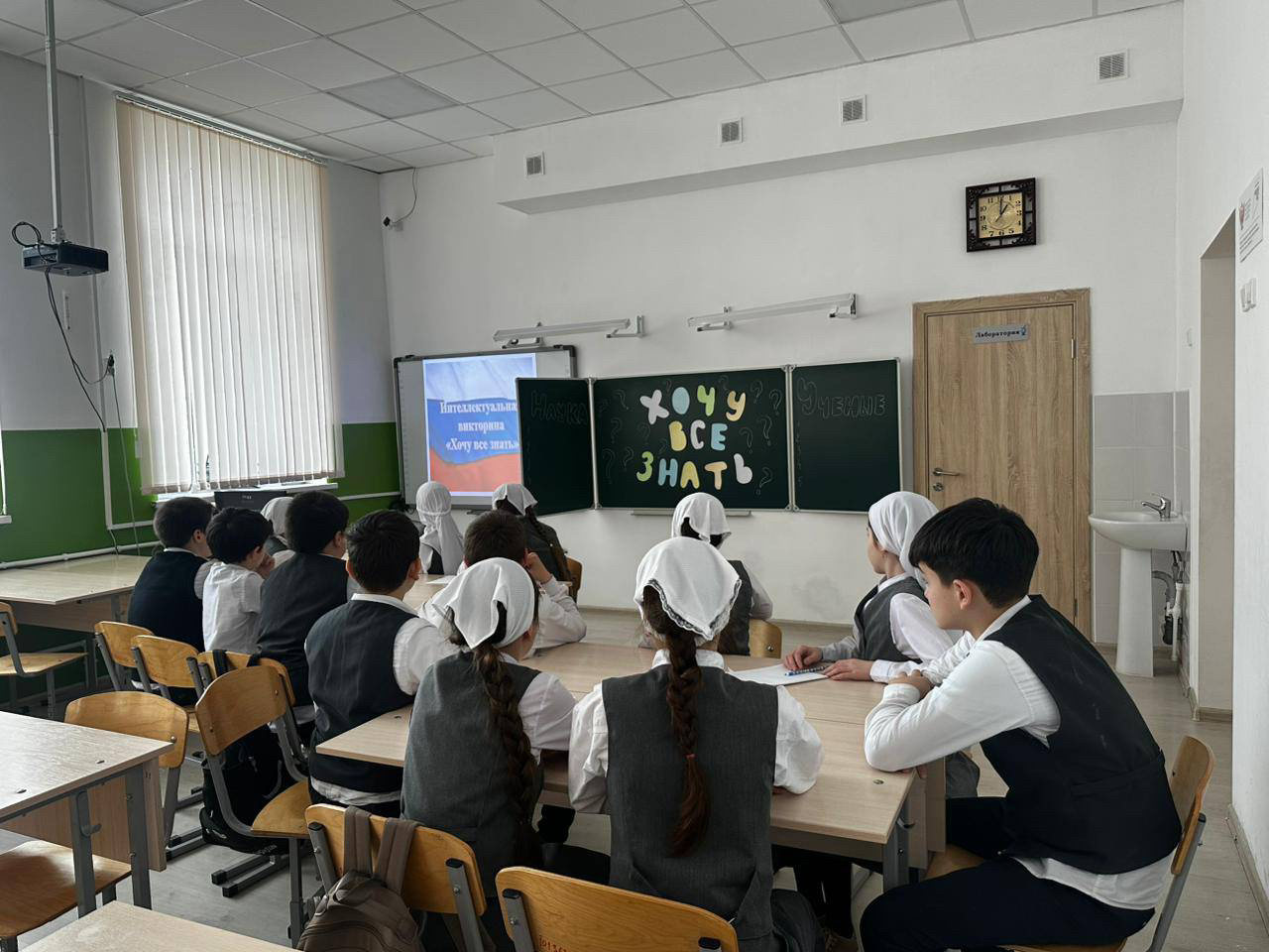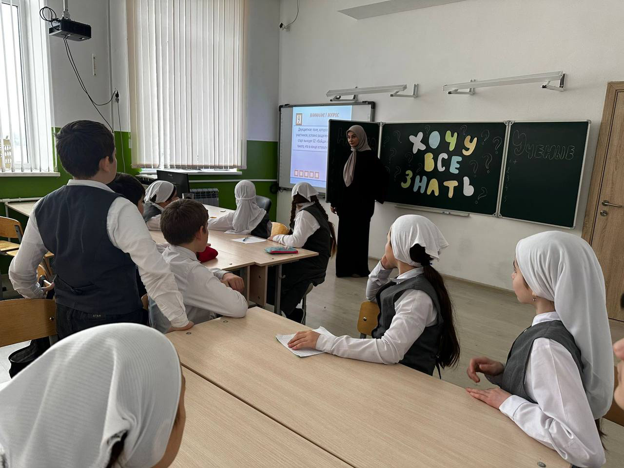 Классный руководитель 5 «в» класса Мусаева М. С-Х. провела с учащимися викторину «Хочу все знать» приуроченную празднику.