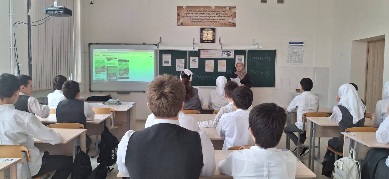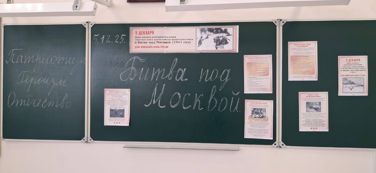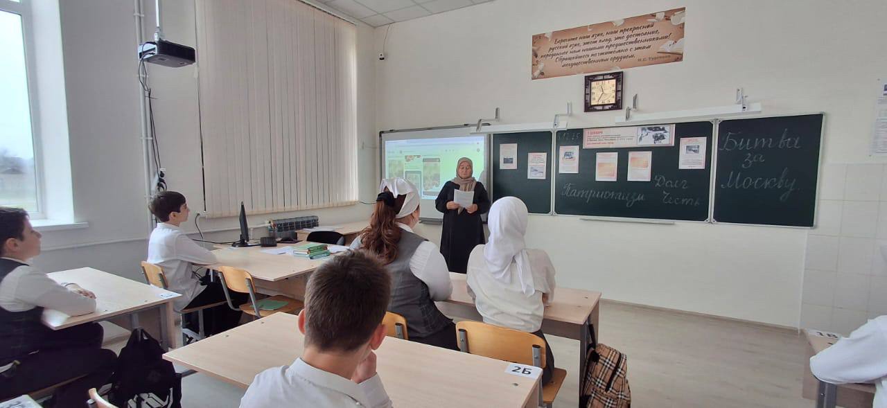 В целях ознакомления учащихся с важным этапом Великой Отечественной войны, развития интереса к истории, воспитания чувства патриотизма и гордости за героические поступки советских воинов, 4 декабря в МБОУ «Новотерская СОШ им. Э. Хамидова» в 7в классе прошел классный час на тему: «Битва под Москвой».