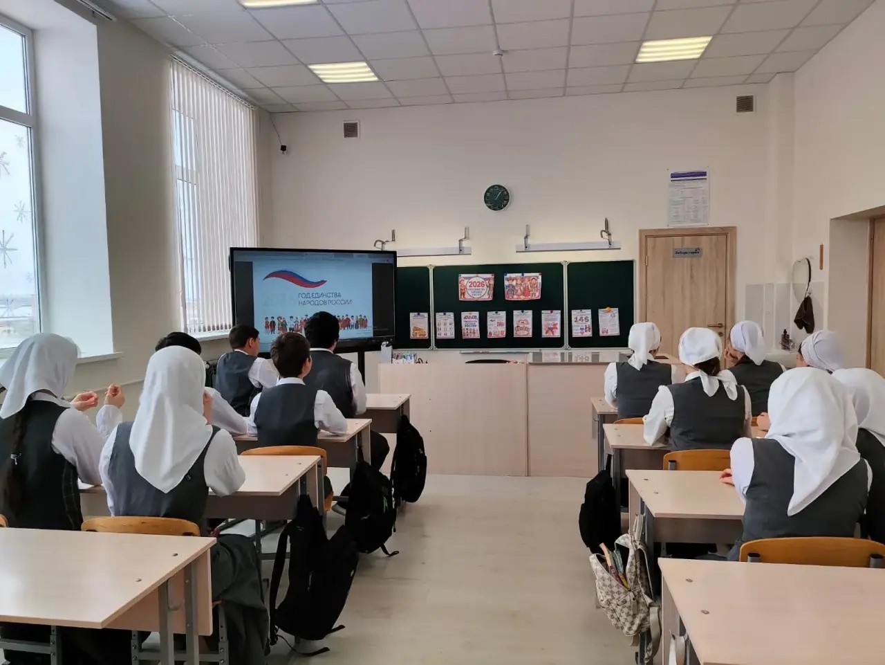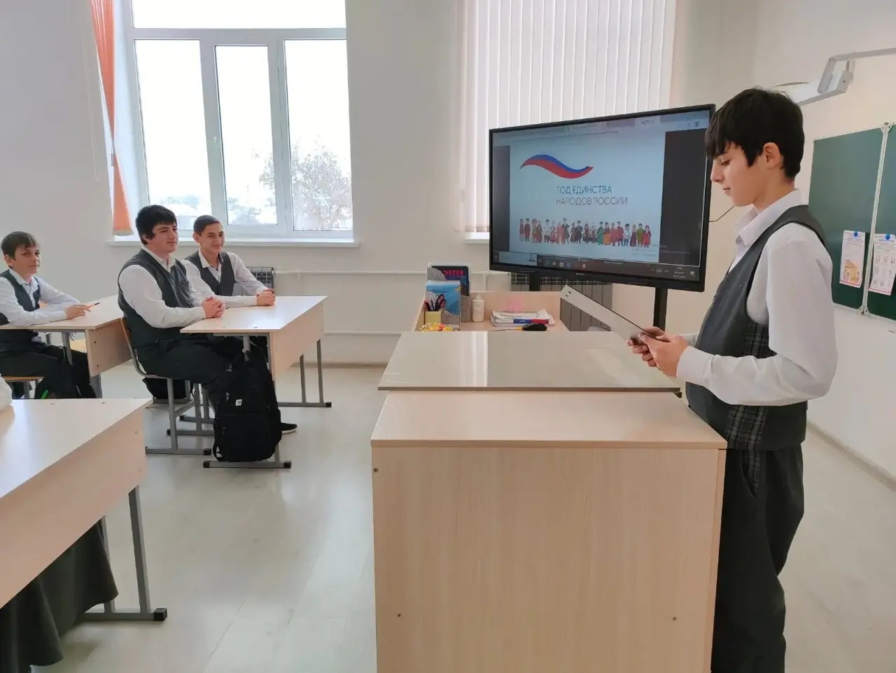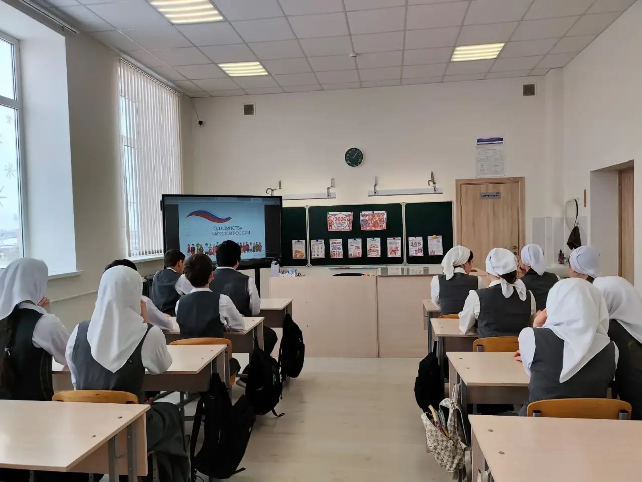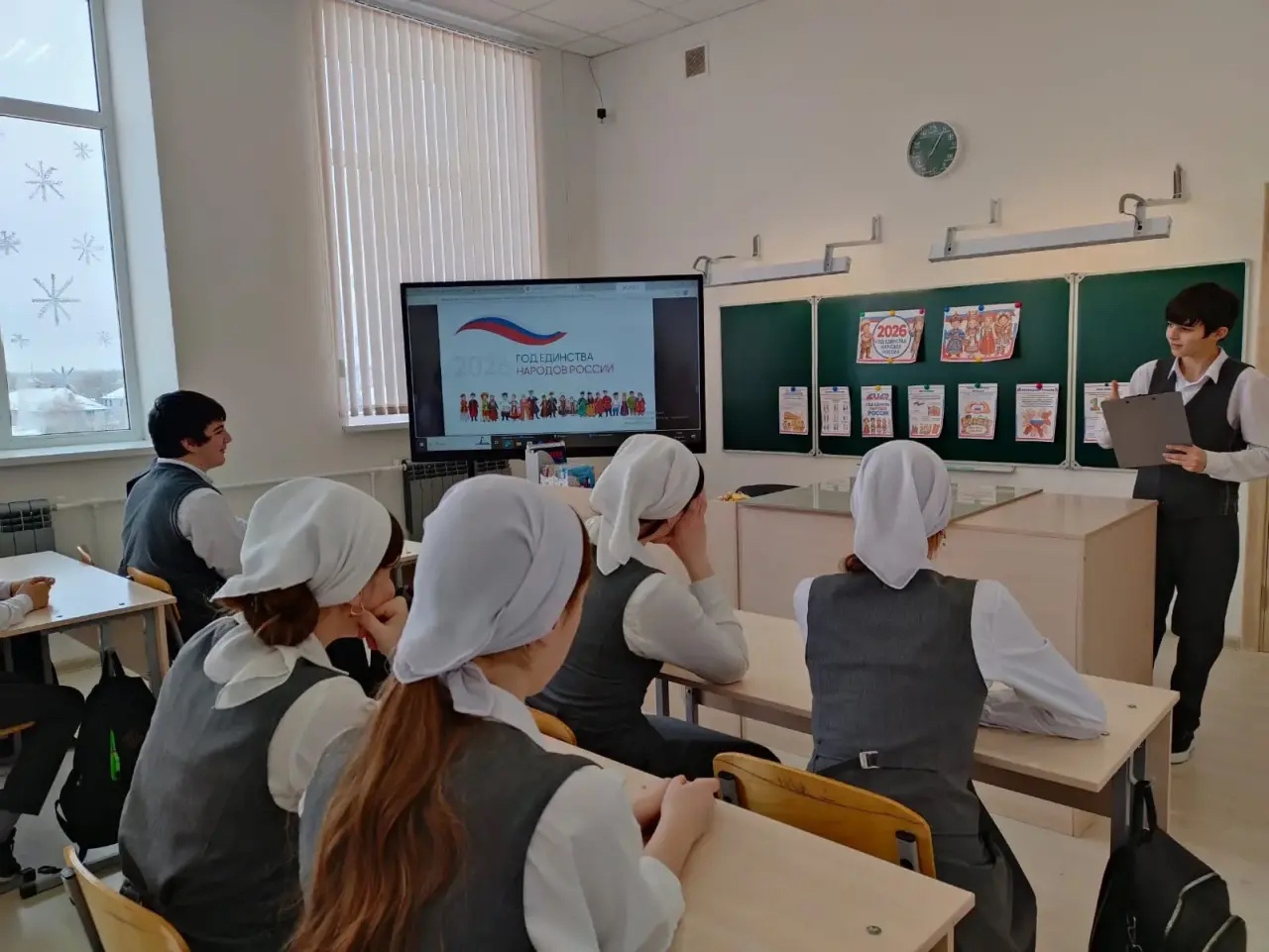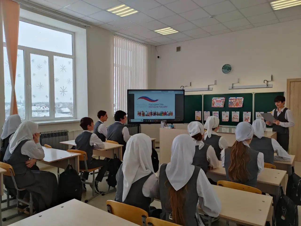 20.01.26 в МБОУ «Новотерская СОШ им. Э. Хамидова» в 9в классе прошел классный час, посвященный году единства народов России. Единство народов России - это стратегический приоритет, закрепленный в объявлении 2026 года Годом единства народов России Указом Президента. Основная цель-укрепление межнационального согласия, взаимопонимания и общероссийской гражданской идентичности при сохранении самобытности каждого народа. Это достигается через мероприятия, направленные на диалог культур.